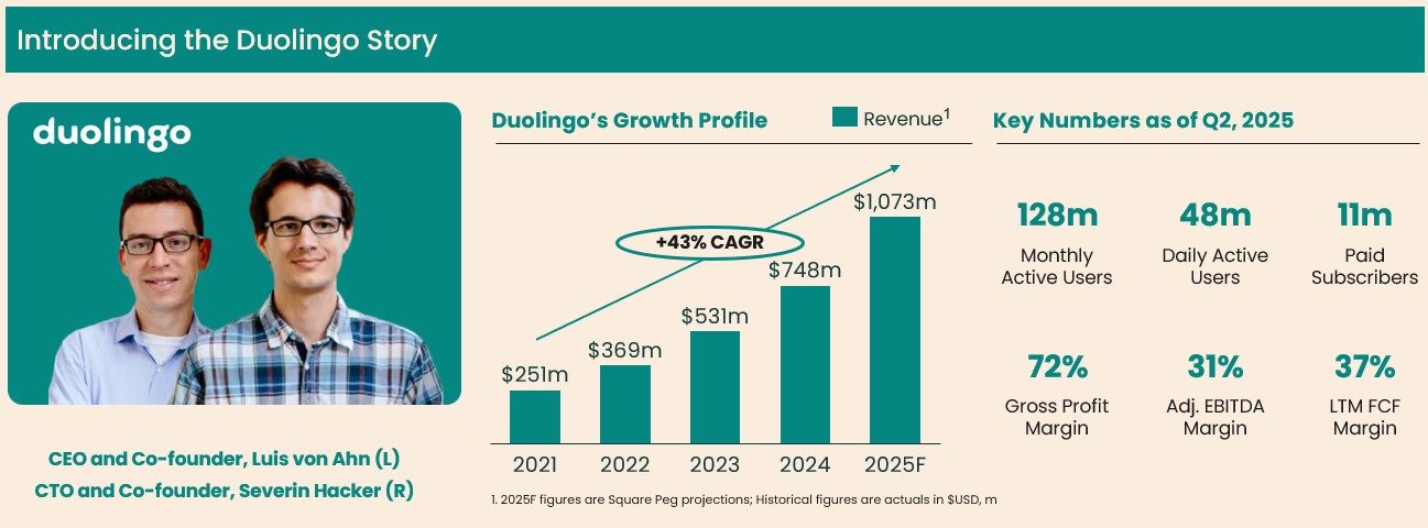 Duolingo was one of the earliest investments of Square Peg’s Global Tech Fund in 2021, made recently after the company went public, and one of our strongest performers in the years since. From an investment perspective, consumer businesses are often more difficult to build and manage - whether it's acquiring or retaining customers or maintaining a durable moat.