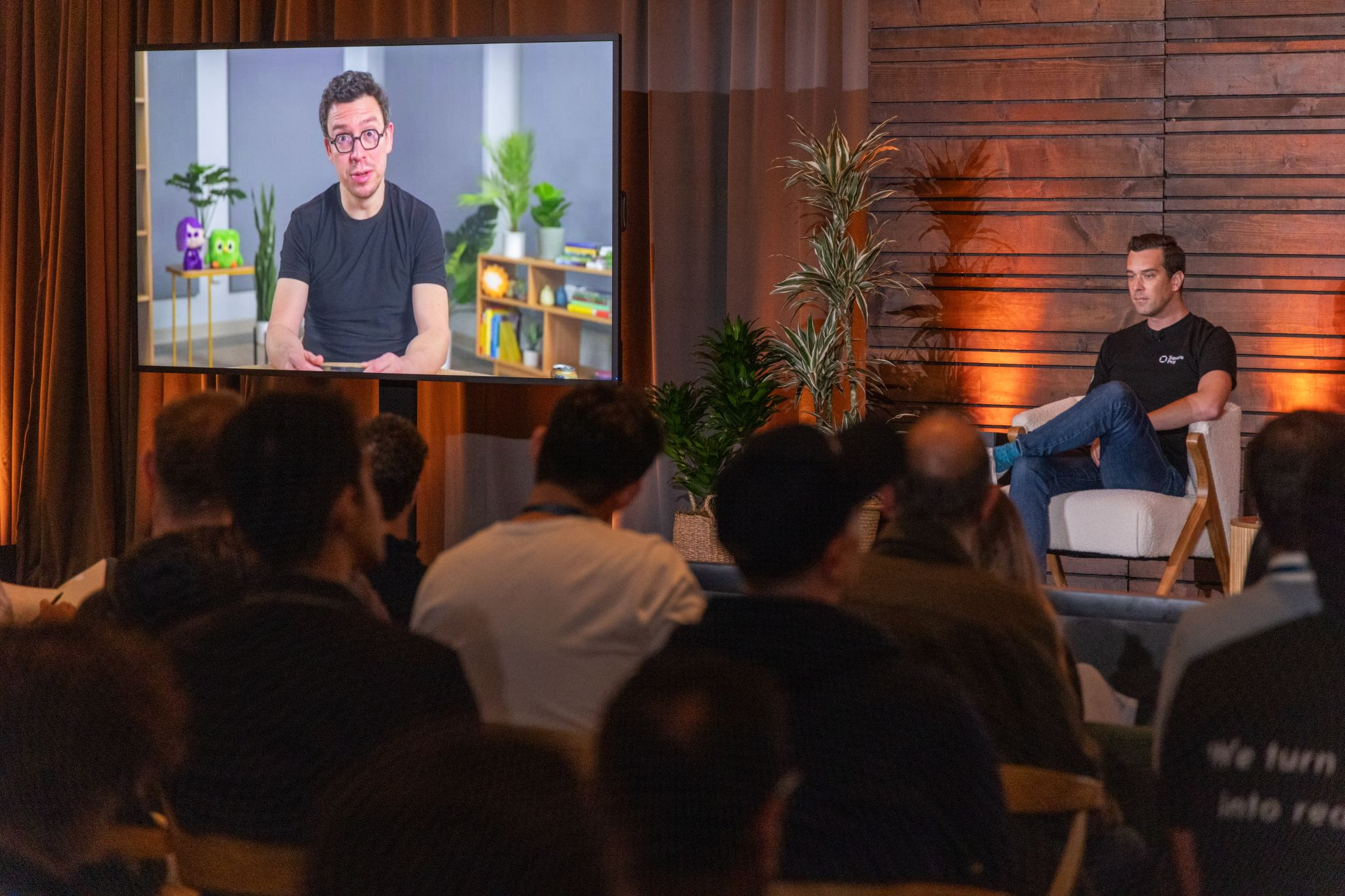 Duolingo Co-Founder and CEO Luis von Ahn and Square Peg Global Tech Fund Portfolio Manager Ben Hensman in a fireside chat, sharing learnings with Square Peg’s founders Founder Summit 2024, San Francisco